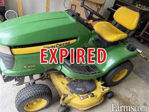 JOHN DEERE X320/48 LAWN TRACTOR, 2010, 22hp, Kawasaki, gas, v-twin, air cooled engine, twin pedal foot controlled hydrostatic transmission, cruise control, 48" side discharge mower deck, foot operated deck lift w/spring assist, 22x11-10 turf rear tires, 15x6.5-8 turf front tires.