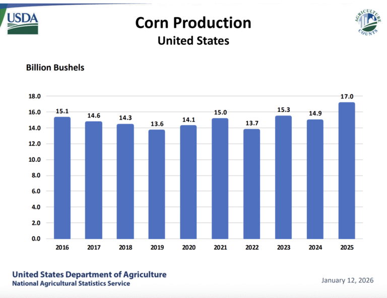 “USDA also raised harvested acreage 1.3 million acres to 91.3 million acres, resulting in a record crop totaling 17.021 billion bushels, up 269 million bushels from USDA’s previous estimate in November and up over 2 billion bushels, or 14%, from 2024,” Blythe reported. “USDA also raised its forecast for U.S. corn stocks at the end of the 2025-26 marketing year by 198 million bushels to 2.227 billion bushels, a seven-year high.”