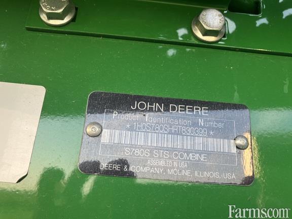 AVAILABLE SUMMER,JOHN DEERE S780 CORN COMBINE, 2024, 2 speed POWER REAR WHEEL DRIVE, 13.5 liter, 6 cylinder diesel, 473HP, 523hp during unloading power boost, 110V coolant heater, JDLink MTG, hydrostatic ProDrive transmission w/Harvest smart, CommandTouch 5 speed contour master feeder house w/reverser, 3.5" lift cylinders, hydraulic fore/aft tilt frame, dual lateral tilt cylinders, Tristream extended wear rotor with Kondex Revolution extended wear round bar concaves, Dyna-flo plus deep tooth touch set electric adjust chaffer and sieve, adjustable front chaffer, Premium cab, E/H header and separator controls, premium header controls, 3 position header height resume, dial-a-speed, leather air suspension heated seat, leather buddy seat, Climatrac automatic cab temp controls, premium AM/FM radio, refrigerator, 12.8" G5 plus color command center arm rest display w/ harvest monitor & touch set combine adjustments & extended 12.8" (G5) monitor, Ultimate technology package, renewable licenses for AutoTrac, RowSense, Section Control, Data Sync, Documentation, in field data share, machine sync, AutoPath, turn automation & Combine Advisor Plus, (subscriptions required), active terrain adjustment, active yield plus moisture & yield sensors, REQUIRES JD STARFIRE GLOBAL POSITION RECEIVER WHICH IS "NOT" INCLUDED. VisionTrak grain loss and tailings monitor, machine Sync antenna kit, Premium visibility LED lighting and extremity lights, electric adjust heated mirrors, 3 Cab Cam cameras, LED beacon lights, 400 bu grain tank, power fold tank covers, extended wear grain handling system, 28.5' extended wear unloading auger, extra full grain tank sensor, clean grain auger & fan bottom shields, wide spread 2 speed fine cut chopper with advanced PowerCast tail board, wind compensation and in cab controls, in cab knife bank adjustments, track ready axle, final drive remote grease lines, Goodyear LSW1250/35R46 R-2 flotation tires, Goodyear LSW750/60R30 R-1W steering tires. JD FACTORY ENGINE ONLY WARRANTY UNTIL 06-02-2026 OR 2000 HOURS.
