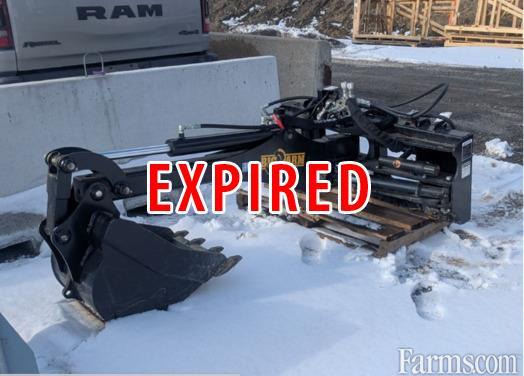 HLA Big Arm backhoe, mounts onto most skid steers and track loaders,18" bucket, 6' digging depth, hyd. swing cylinder with 140° swing, boom can be center or offset mounted, flat face hyd. couplers, 14 pin electric connector wiring for Kubota SVL series (can be changed), minimal usage, price is plus tax, Berg Equipment - 905-899-3405 - 42134 Hwy 3, Wainfleet, ON (Tag A10029)